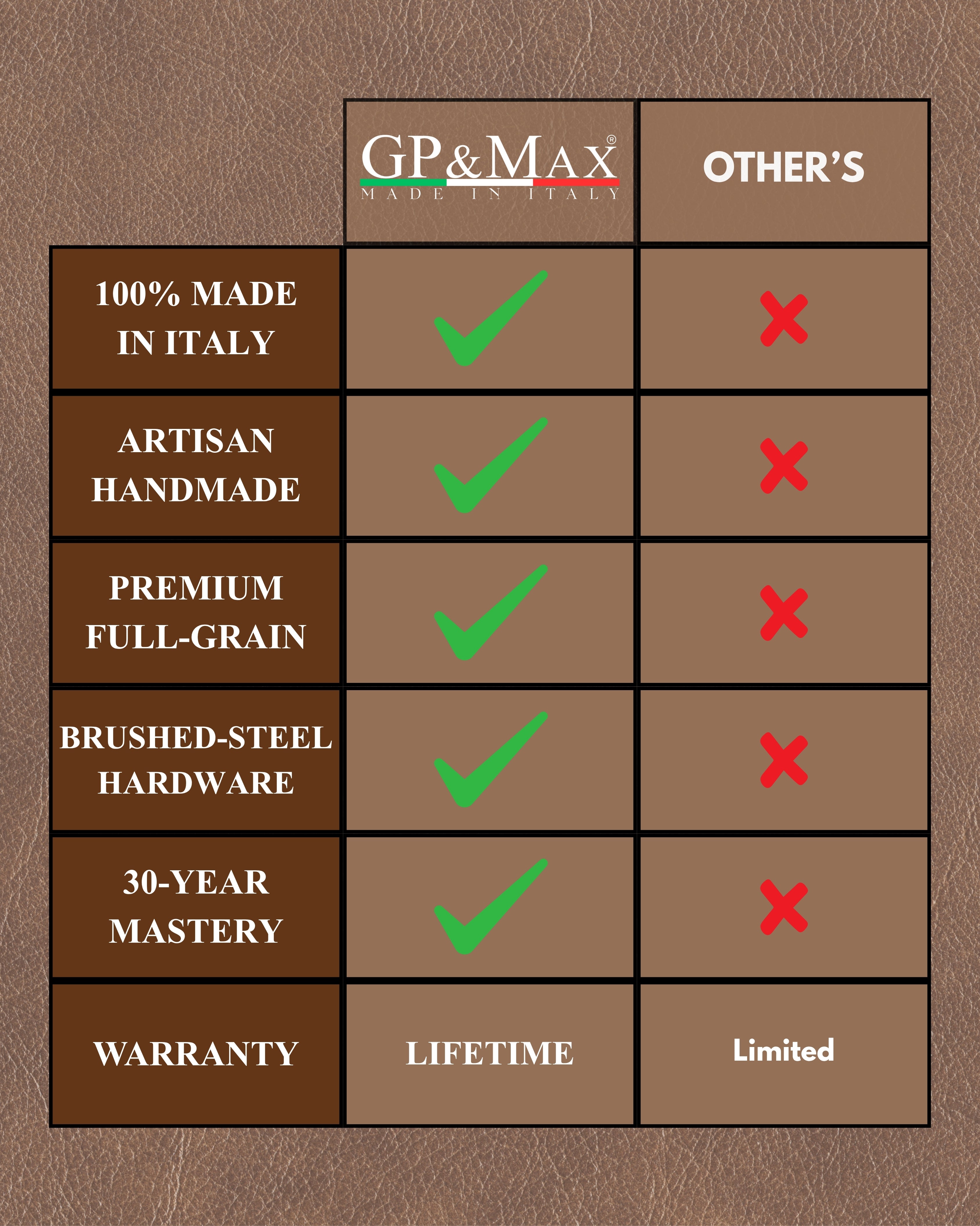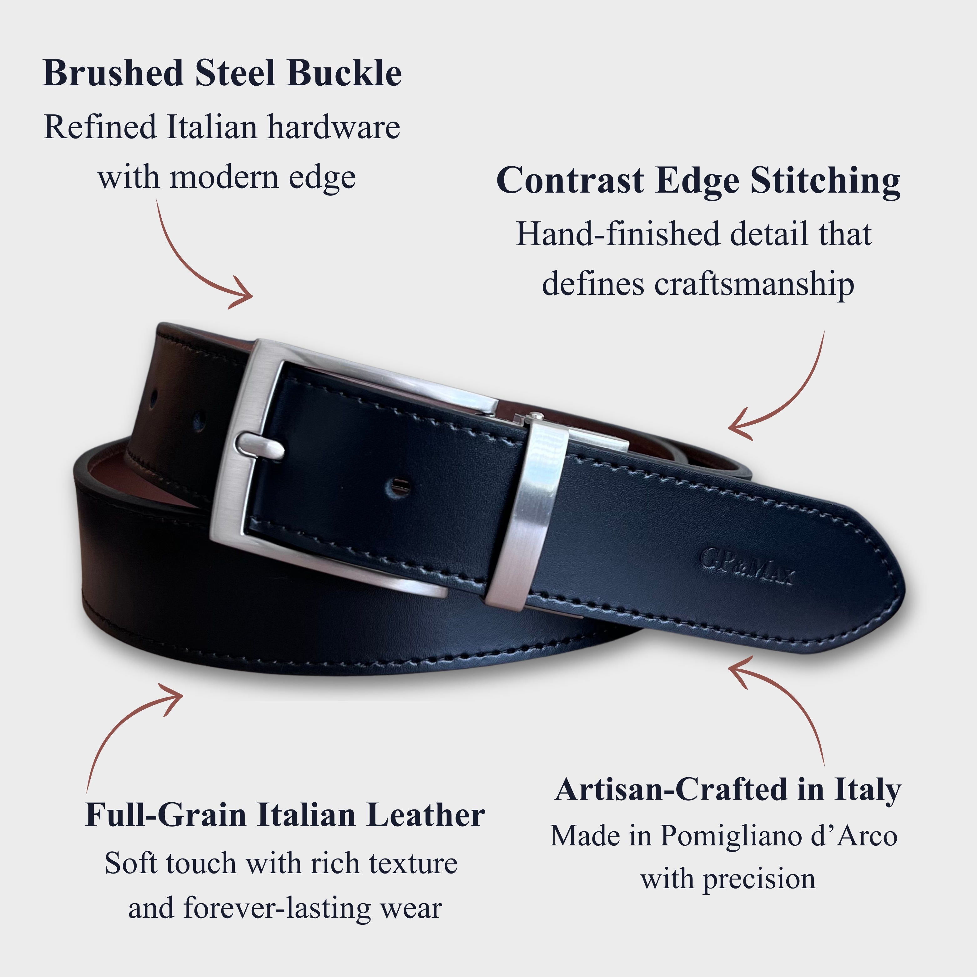 When you invest in a GP&MAX belt, you’re investing in craftsmanship that’s meant to last a lifetime. Every piece we create is handcrafted in Italy by skilled artisans who pour decades of expertise into each stitch, edge, and buckle.
