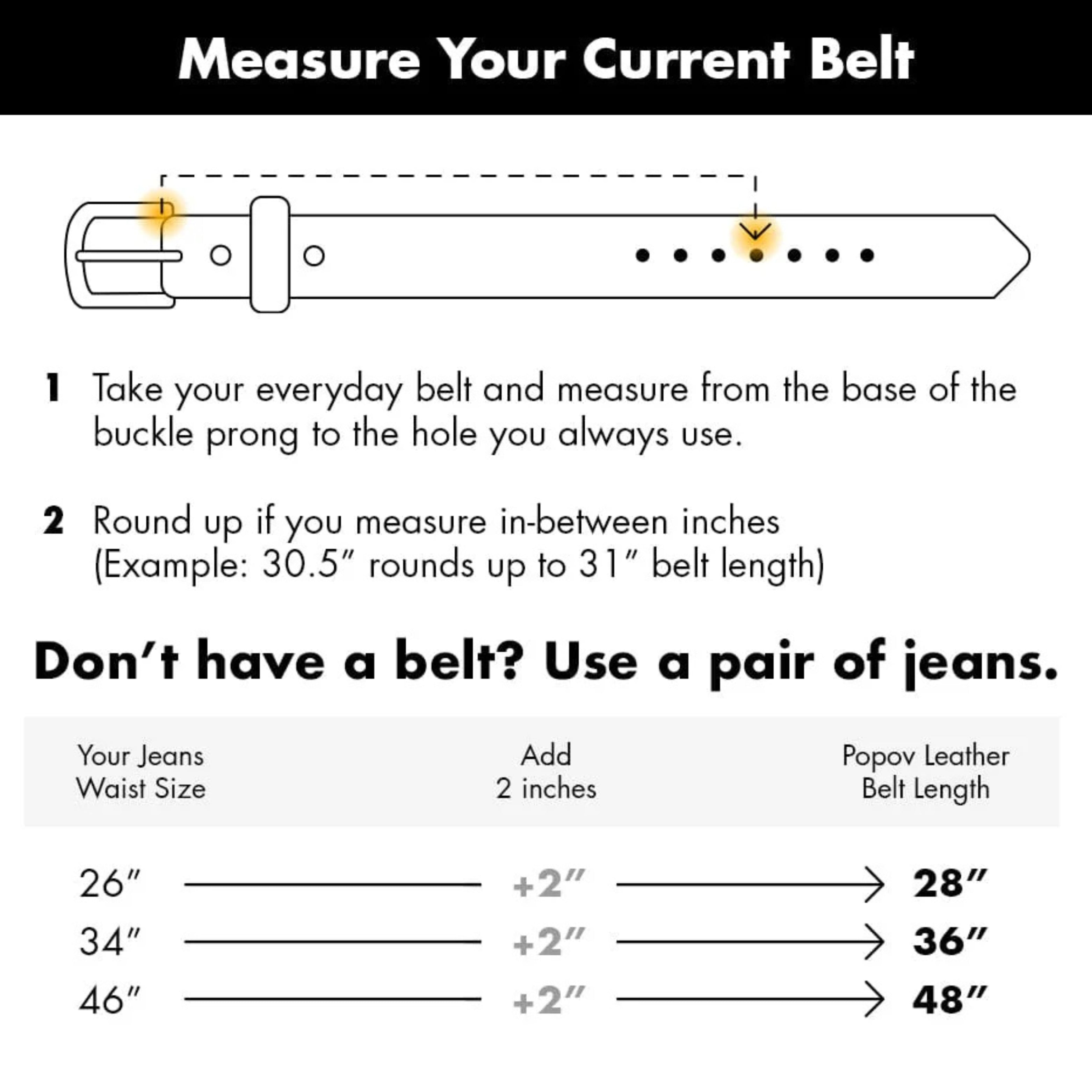 - Example: 34 waist buy 36 belt. Round up if in between sizes.